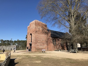 Hold mouse here for more info!The tower is the only part remaining from the 1639 church at English America’s oldest permanent settlement, but work is underway to build a replica of the rest of the church, based on details found in 21st century excavations. This is probably the oldest church remnant in English America.